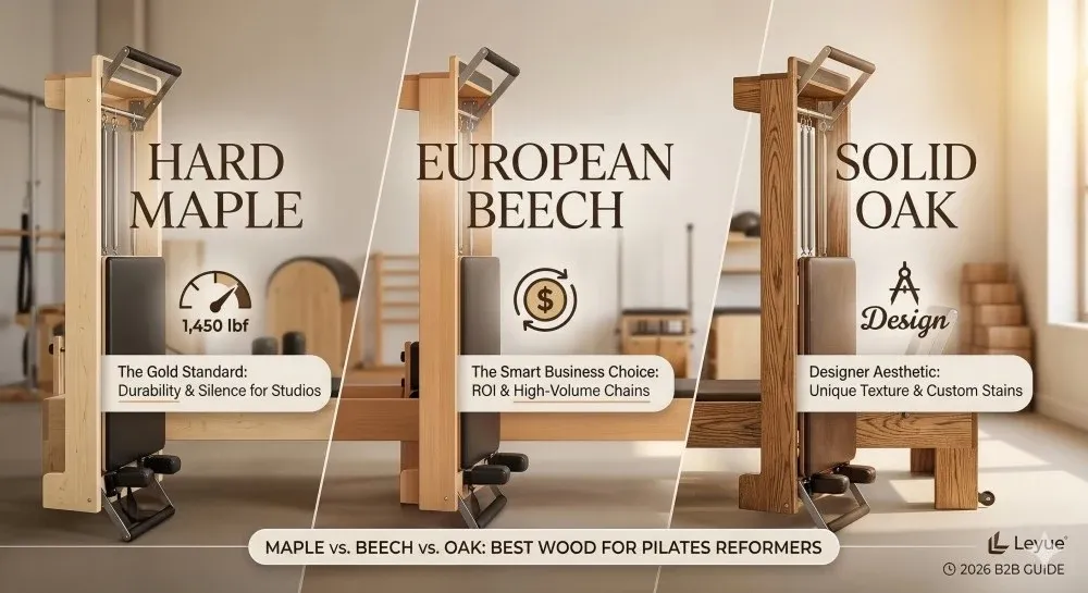 Compare Maple, Beech & Oak for Pilates reformers. Learn why Hard Maple is the studio gold standard for durability, stability, and ROI in B2B procurement.