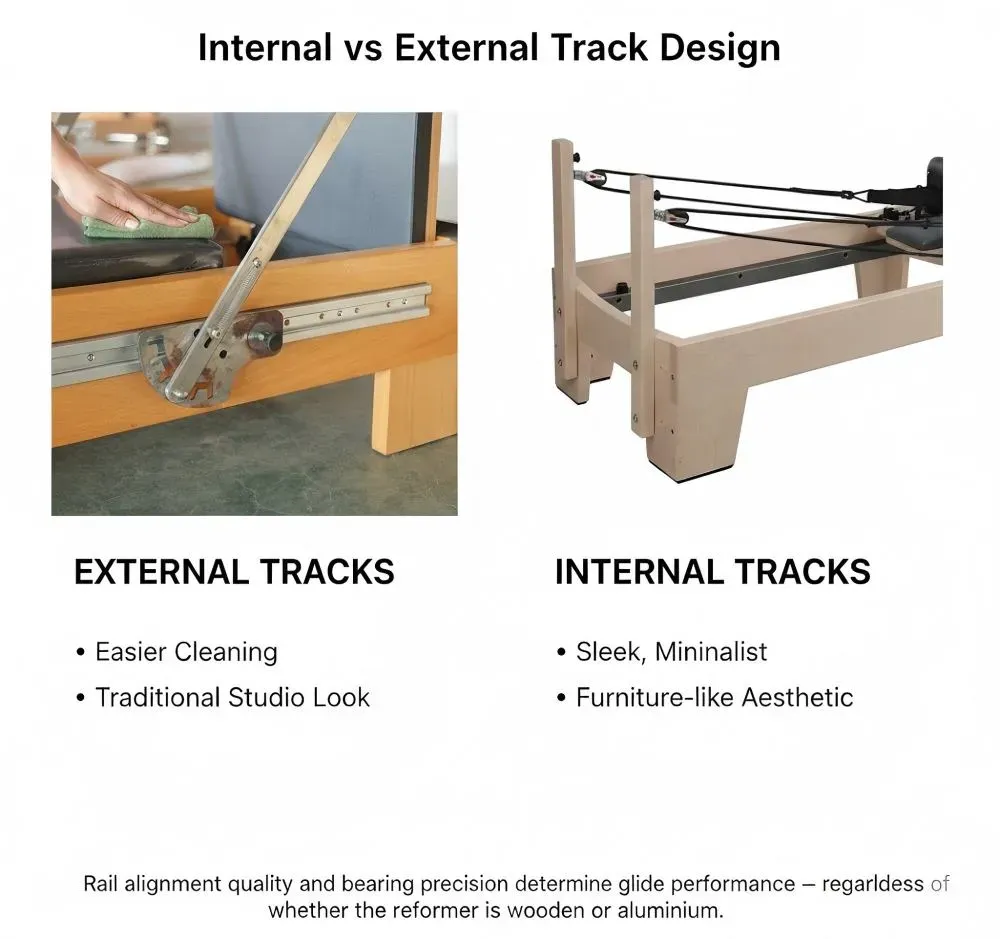 Rail alignment quality and bearing precision determine glide performance — regardless of whether the reformer is wooden or aluminum.