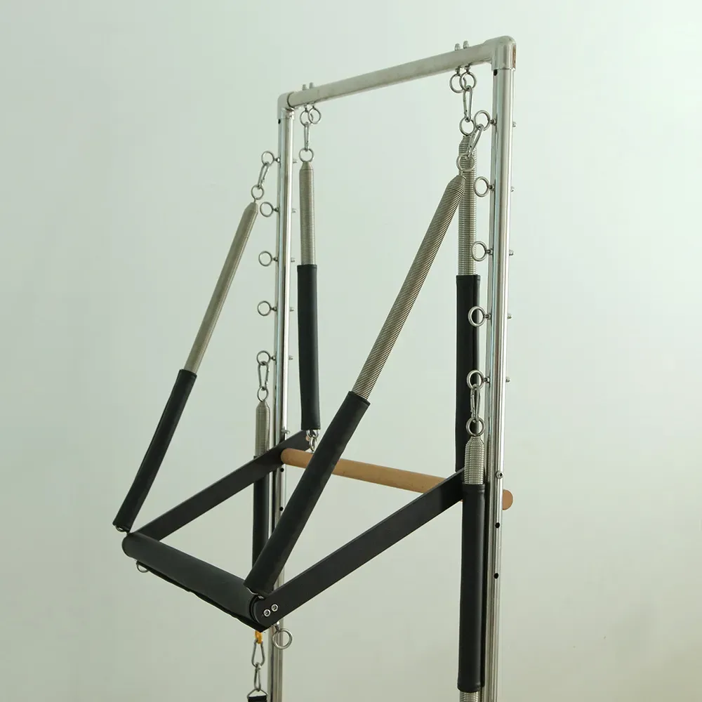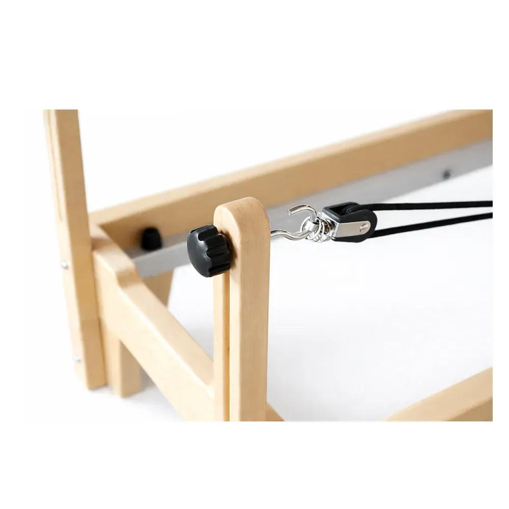 Constructed from hand-sanded sustainable maple wood and integrated with a stainless steel half trapeze tower, this system combines full reformer functionality with vertical spring resistance in one refined structure.