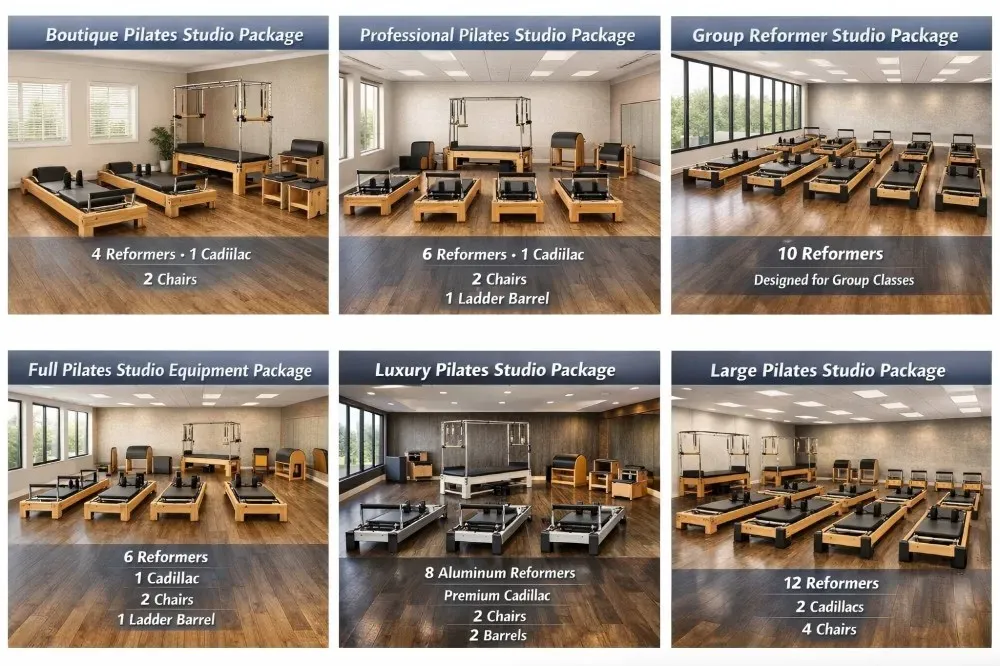 Premium commercial Pilates bundles featuring high-performance wood & aluminum Reformers, Cadillacs & Chairs. Factory-direct wholesale for boutique studios & gyms.